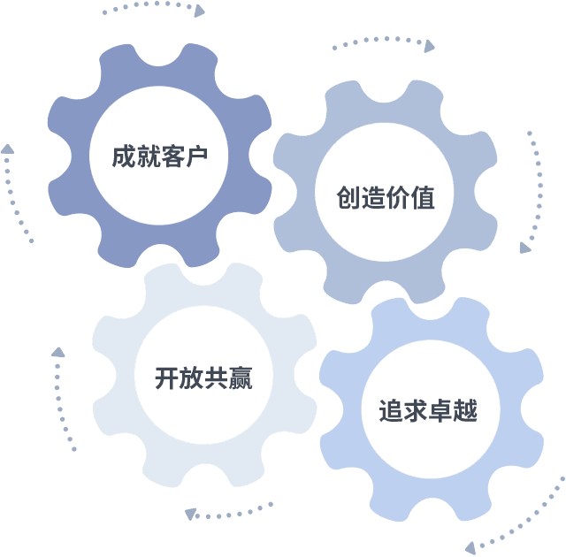 成就客户是一切决策的出发点,,创造价值是衡量所有工作的标准,,,追求卓越是我们做事做人的态度,,开放共赢是我们的格局也是最终的结果。。。。价值观的齿轮环环相扣,,推动着组织里的每个人不断向前。。。。